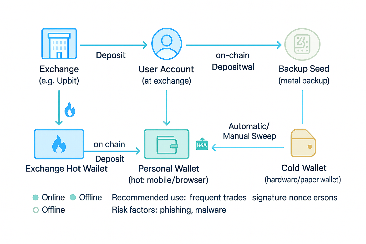 | 거래소 보관 | 거래소 | 상시 온라인 | 편의성·복구 수월 | 거래소 리스크·출금 지연 |