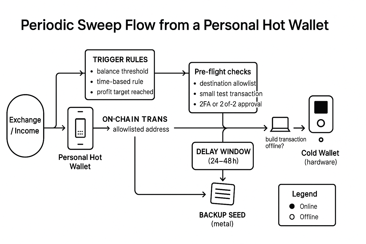 - 대규모(장기 보유): 1억원 이상은 콜드월렛 권장. 24/48시간 지연 출금 정책 고려.