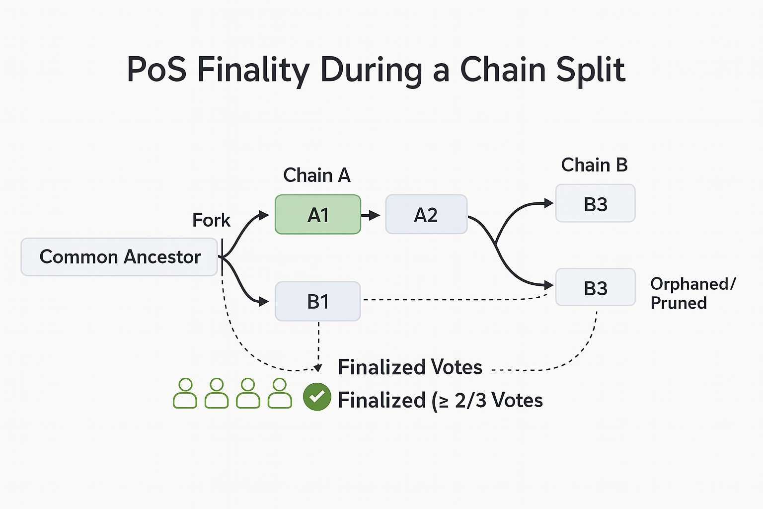 - Nothing at Stake: 분기 시 다중 체인에 모두 서명하려는 유인이 발생할 수 있어, 슬래싱/프루닝 규칙과 최종성 투표로 억제합니다.