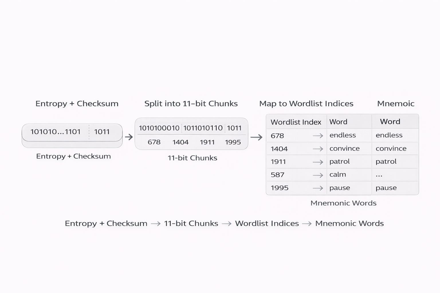 - 각 11비트 값(0~2047)을 사전 정의된 2048개 단어 목록의 인덱스로 매핑해 니모닉 단어를 만듭니다.