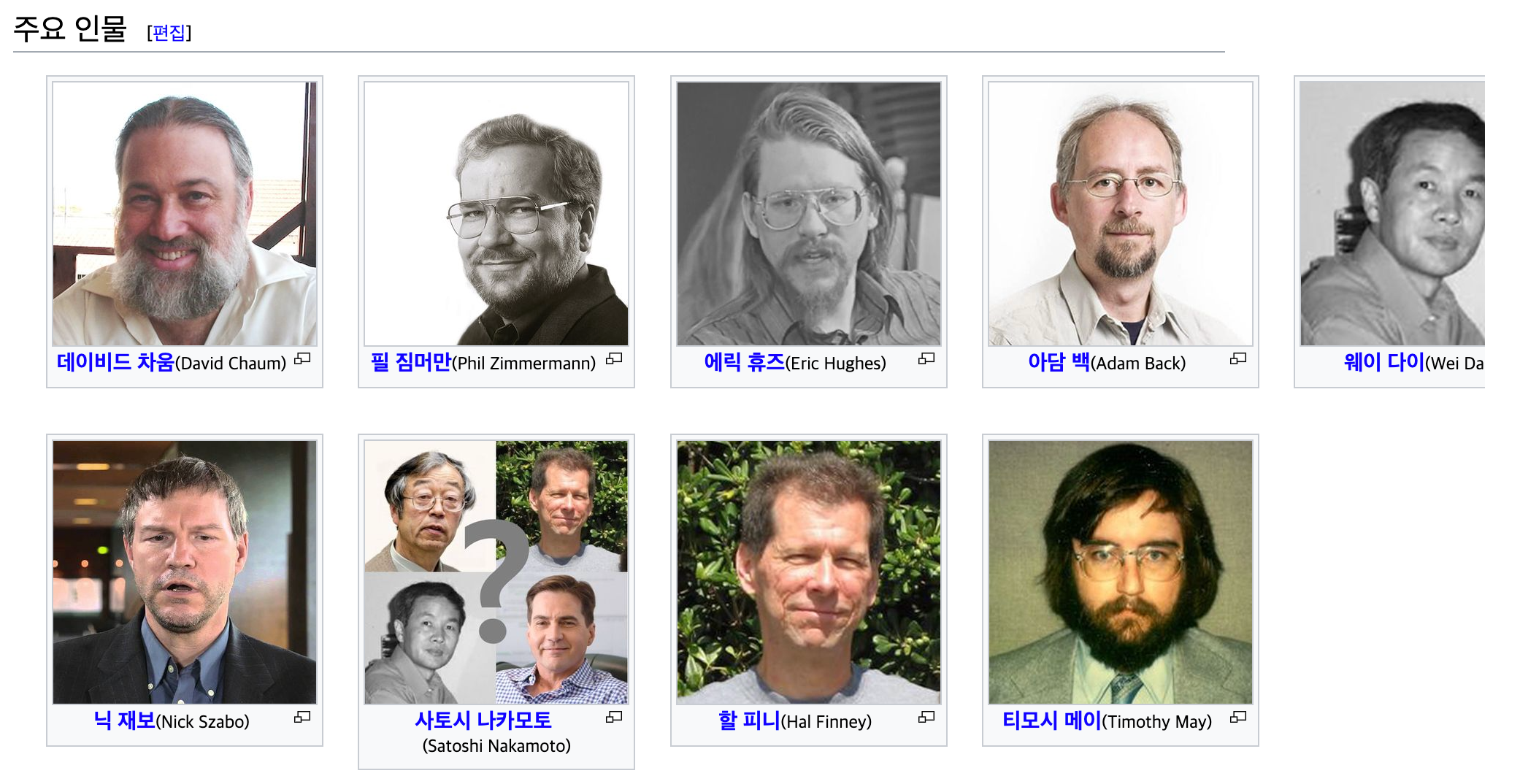 | Adam Back | 해시캐시 설계 | 작업증명, 스팸 방지 |