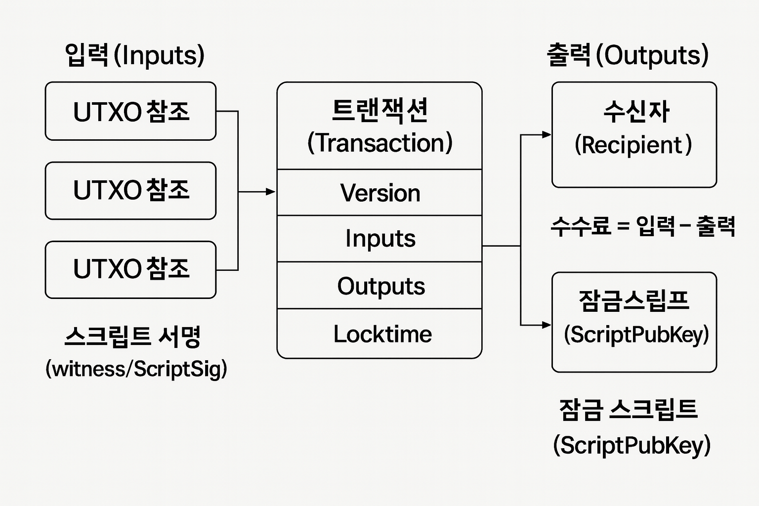 비트코인 트랜잭션의 핵심(입력·출력·스크립트·락타임)과 검증 과정을 구조도·표·예시로 압축 정리. 개발·학습·문서화에 바로 쓰는 가이드.