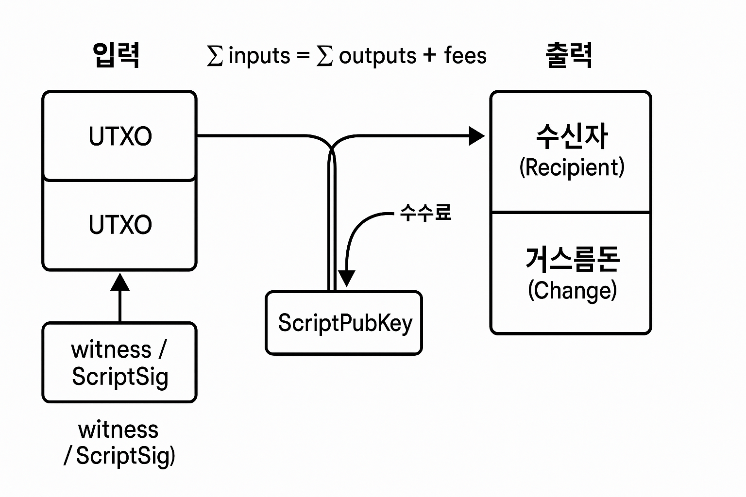 scriptSig(세그윗 전통) 또는 witness 데이터(세그윗)는 소유권 증명을 담습니다.- 여러 입력을 모아 잔액을 합산할 수 있으며, 수수료는