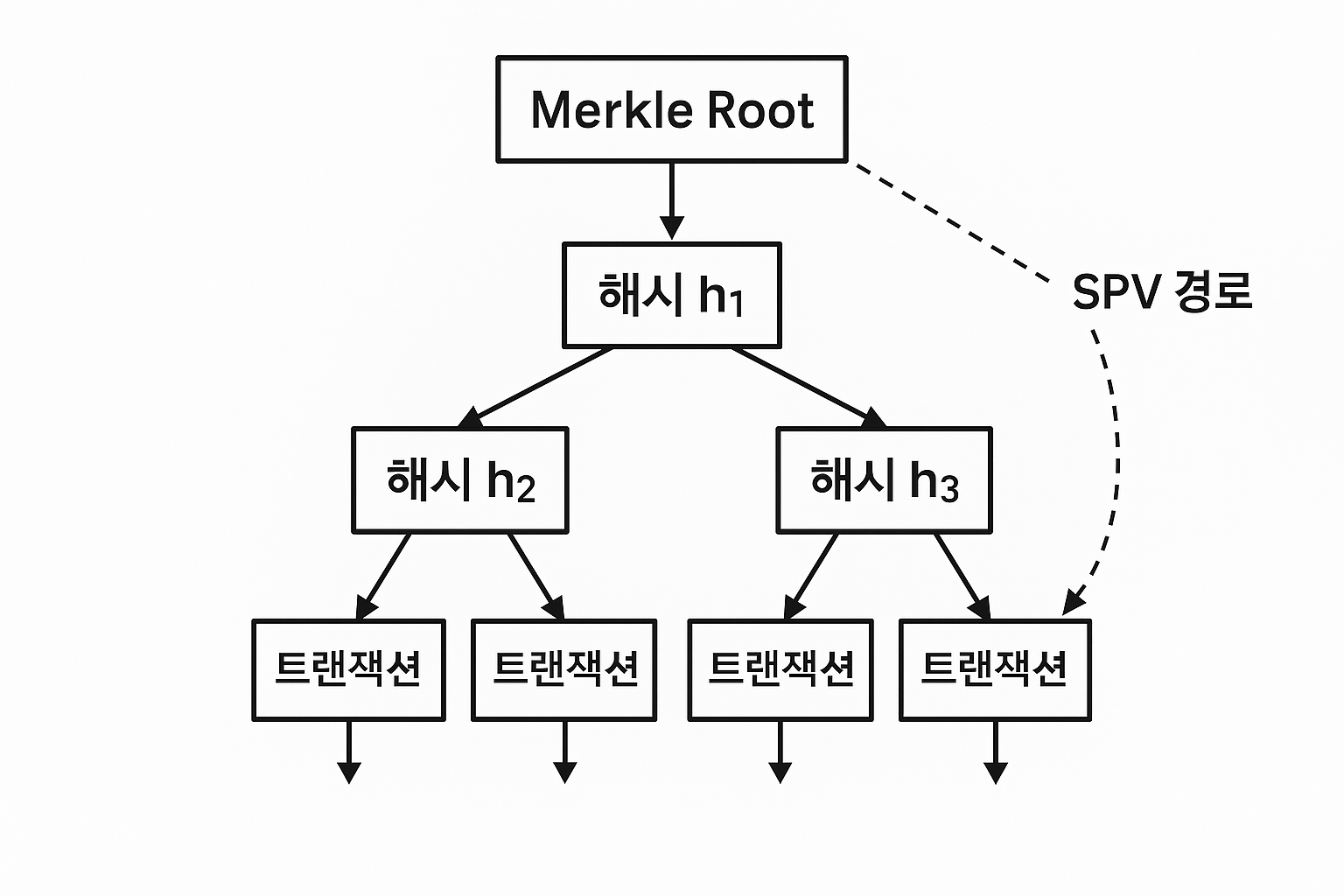 경량 노드(SPV) 는 전체 블록을 받지 않고 헤더 체인만 내려받습니다. 사용자가 제시한 txid와 형제 해시들로 루트를 재계산해 헤더의 루트와 일치하는지만 본 뒤, 작업증명 난이도를 확인합니다. 이 방식은 저장공간과 대역폭을 크게 절약하면서, 결제 수신·거래 확인 같은 실무 시나리오에 충분한 신뢰도를 제공합니다. 보다 기초가 필요하다면 트랜잭션 구조 이해를 먼저 읽어도 좋습니다.