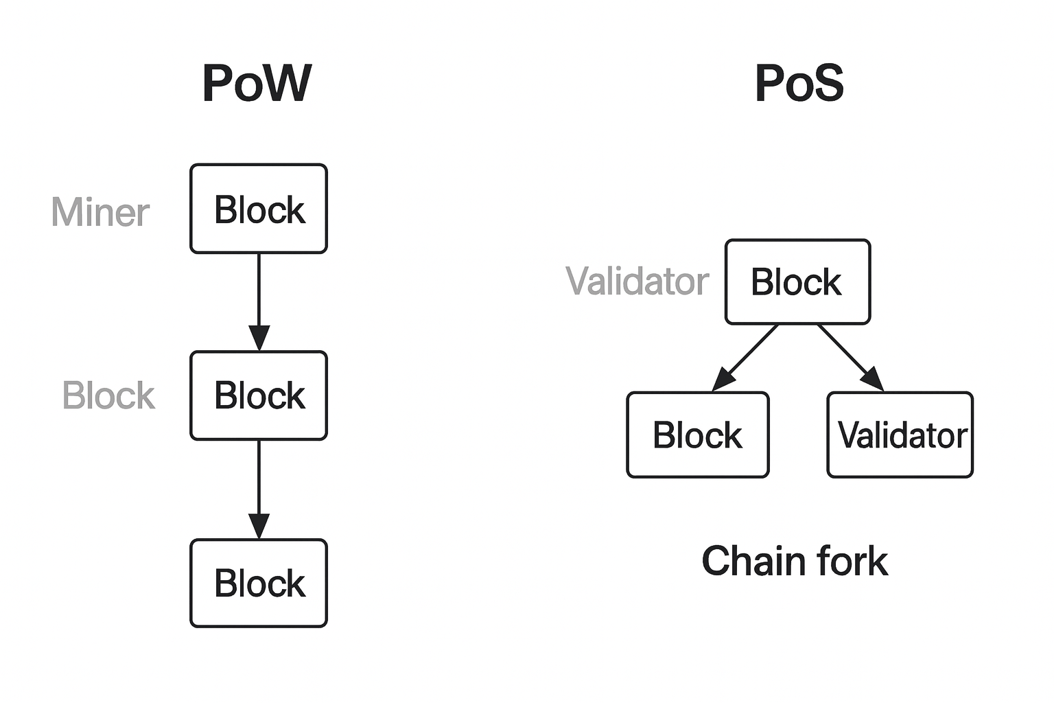 | 구분 | PoW(작업 증명) | PoS(지분 증명, 단순 모델) |