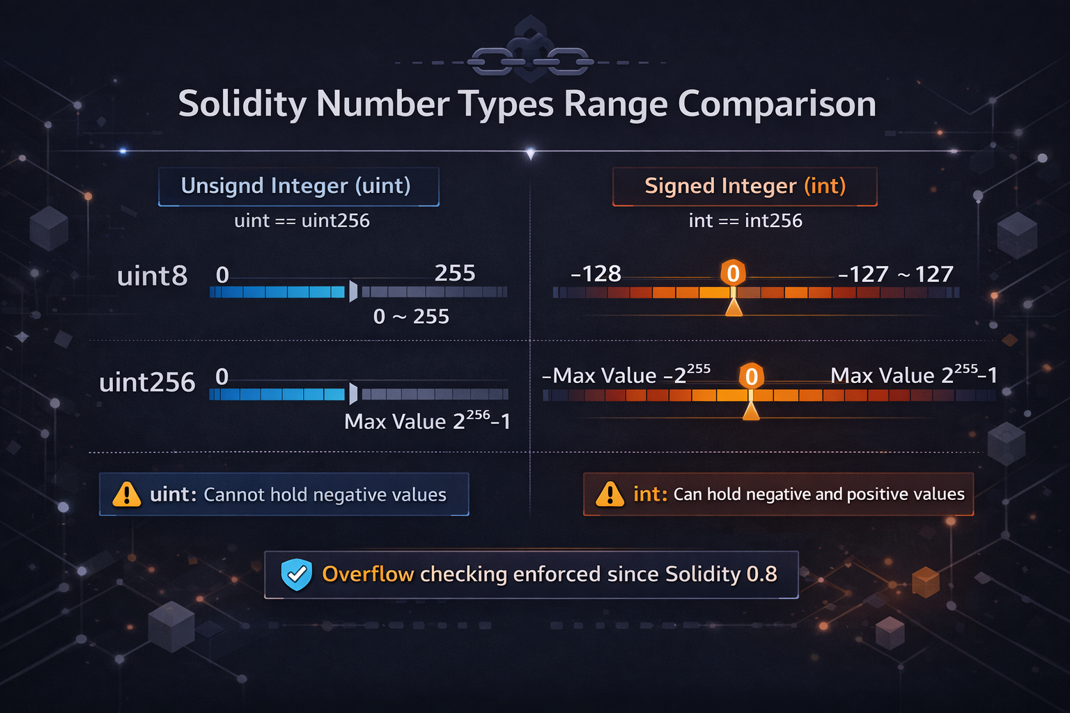 솔리디티 숫자 타입의 핵심을 한 번에 정리합니다. uint/int 범위, 연산 규칙, 0.8.x의 오버플로우 방지와 안전한 코딩 팁을 예제로 확인하세요.