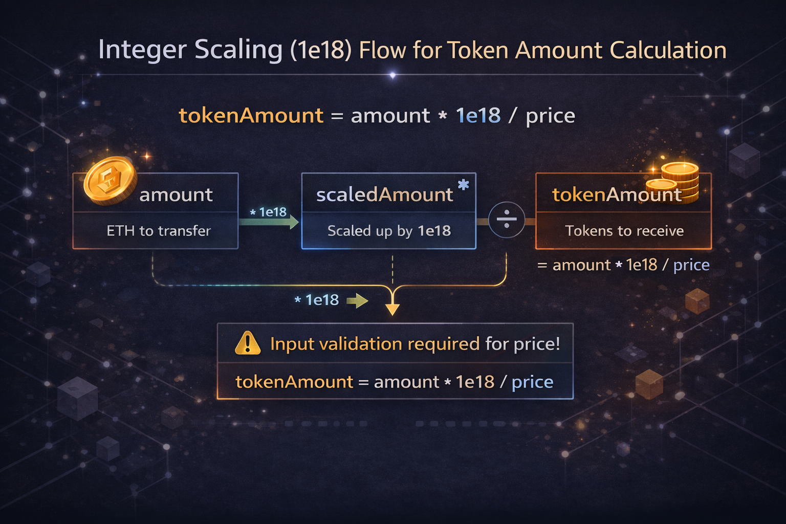 주의: 정수 나눗셈은 소수점을 버립니다. 가격·수수료 계산 시 스케일링(amount * 1e18 / price) 순서에 주의하세요.
